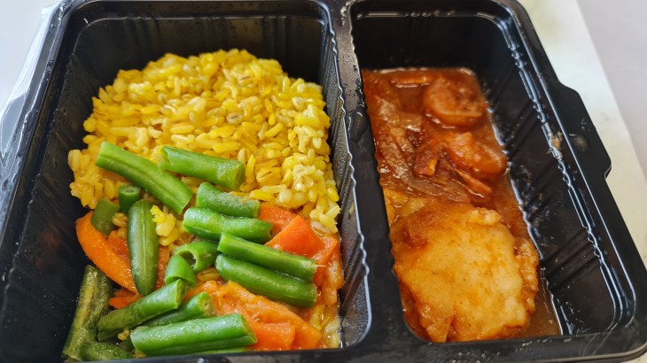 The sambal fish and prawn with turmeric rice look very pretty and appetising. The rice served in the box was rice barley and has a very nice bite to it as it was chewier than Thai fragrant rice. However, there was no turmeric taste in the rice at all. There were in total 3 prawns and a small piece of fish and while the flavours were very on point, the serving was too small. The vegetable was ok and not too mushy but the fish has a slight soil taste. The spicy level is low as the gravy is on the sweet side