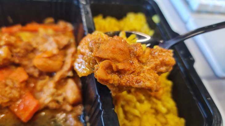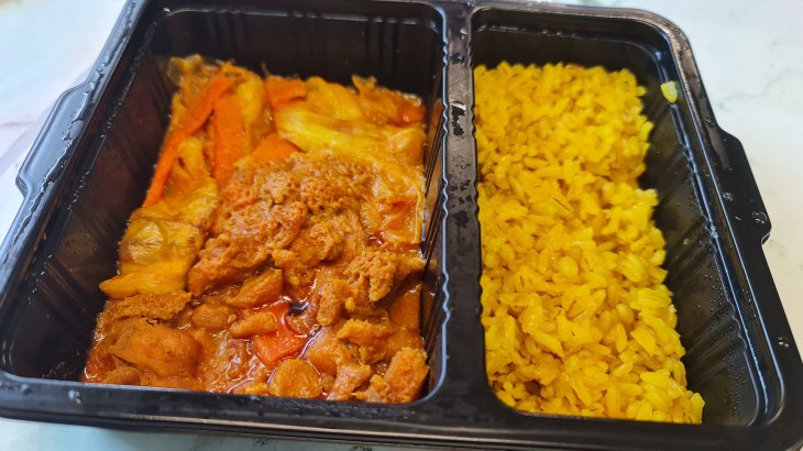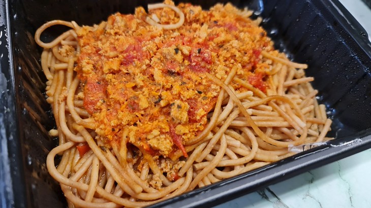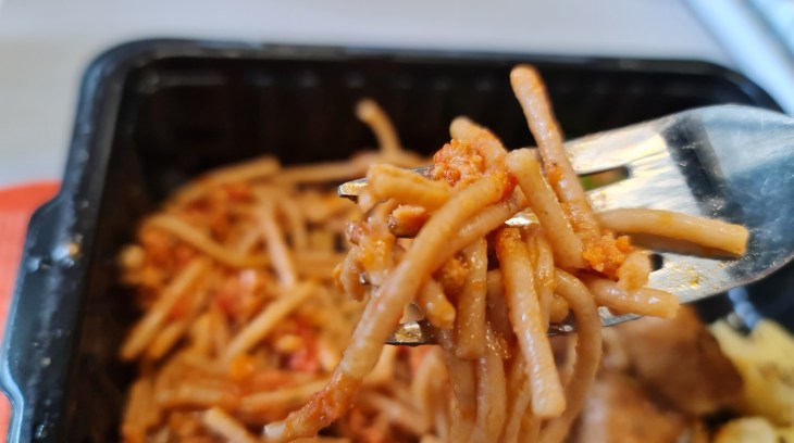 The chicken bolognese spaghetti in comparison to the rest of the meals is quite small in serving size. The chicken bolognese is dry and has not enough sauce to go with the pasta. In terms of flavour, the sauce is savoury with a slightly tangy tomato flavour. If there was more sauce and the serving increased, this would have been one of the best flavours