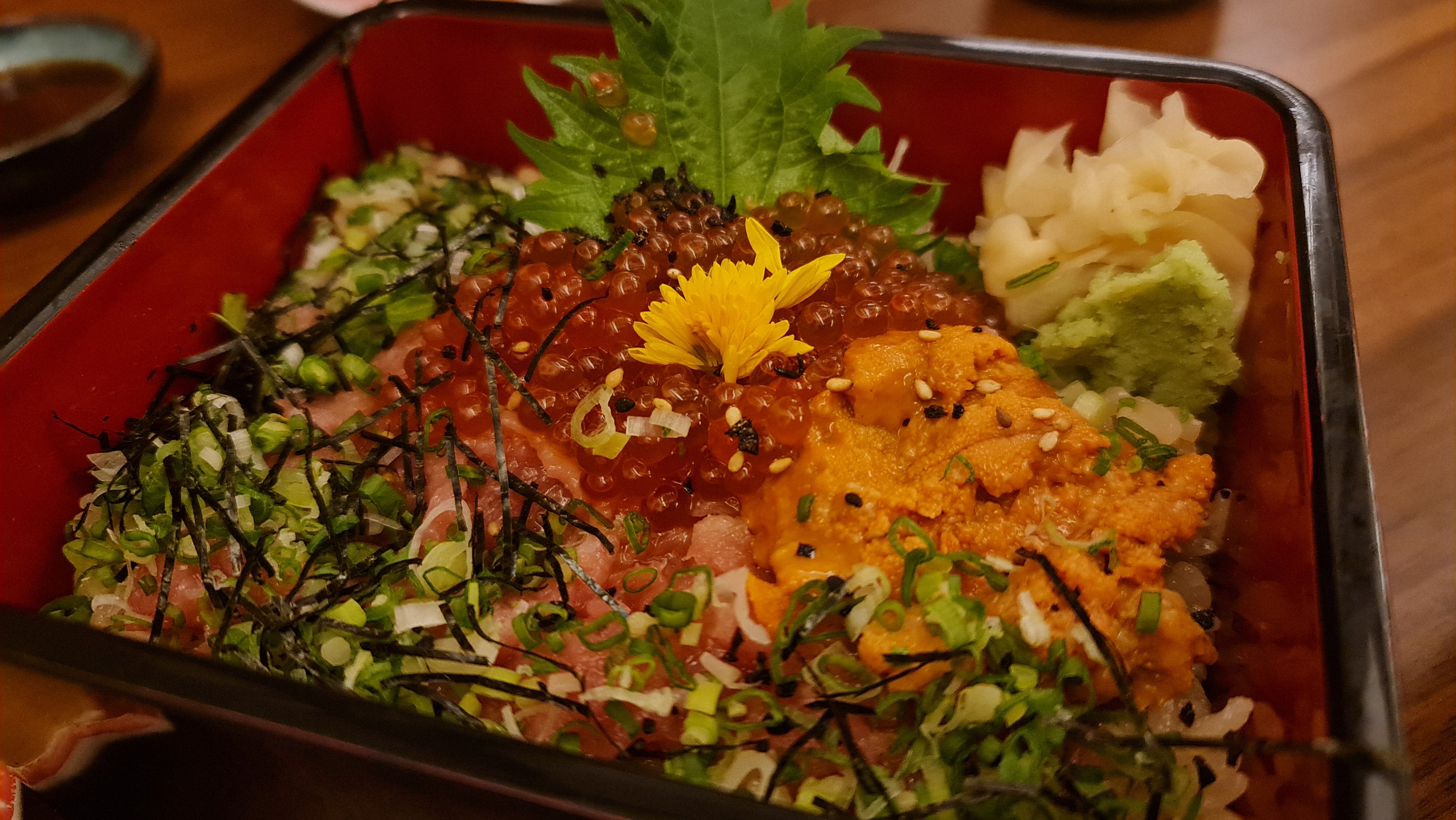 The last batch of mains we had was California maki, soft-shell crab maki and Sanshoku don which contains sea urchins, salmon roe and chopped fatty tuna. The makis were beautifully presented and generously topped with ebi roe. The rice was slightly warm and the ingredients were perfectly harmonised so you can taste the creaminess of the avocado and crab stick of the California maki. The soft shell crab maki was also crunchy with the fried crab and crisp layered on the plate and the sauce was also quite unique to the maki with a creamy and light spice flavour