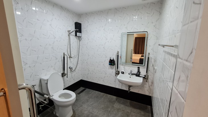 The bathroom was huge with proper elderly and wheelchair aids but there is no curtain or separation between the toilet and the shower so whenever anyone baths, the toilet can get quite wet. Basic toilet amenities like toothbrush, shower gel and shampoo are also provided