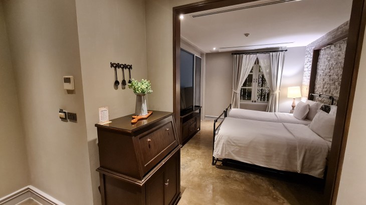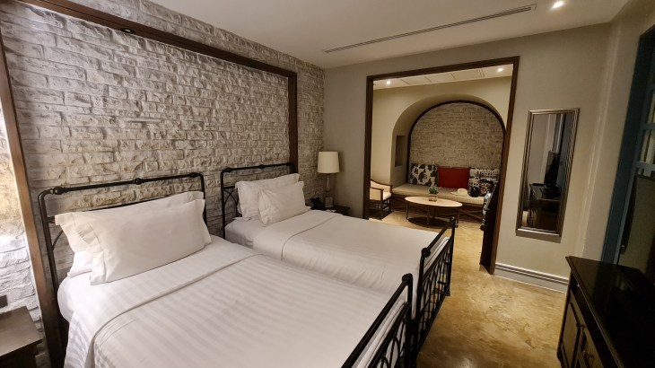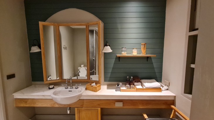 It really felt like coming home as we opened the door to a living area space with an armchair and lazing sofa and coffee table where you can laze around for tea or chit chats. Right at the entrance to the bedroom area is a small wooden dresser which contains the mini fridge and amenities like bottled water, glasses, coffee and tea as well as a kettle. The bed is set on old-fashioned metal bed frames and is hard enough for my liking and the pillows were also soft and fluffy. The TV is placed on a wooden console right in front of the beds for the best viewing experience