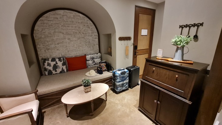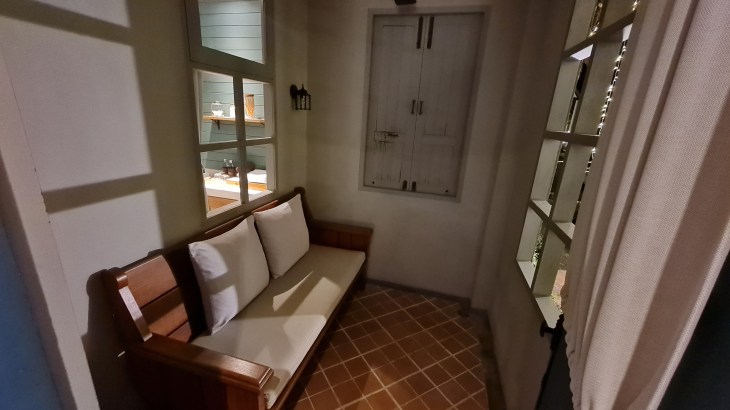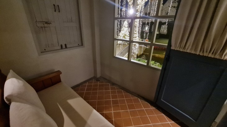 To the right of the console is a door to a small porch where it overlooks the garden through a small window. The same category of the room we booked has options for a porch that opens out to the garden view like the photo I included. Unfortunately, all the rooms with this view were already taken up so we were given the one with a blocked view through the small window. It was pretty noisy as the sound from the water fountains could be heard through our porch so we closed the door completely and did not really hang out on the porch as we only stayed 1 night