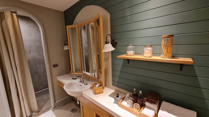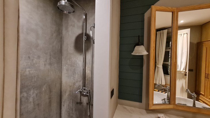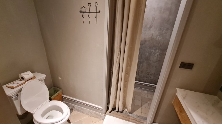 The shower is on the left of the basin and is decorated in a raw concrete manner and covered by a heavy linen curtain instead of those plastic shower curtains so that it blends in with the whole village’s rustic atmosphere. The toilet is in the corner out of the shower facing the basin so other guests can use the toilet if someone is in the bathroom