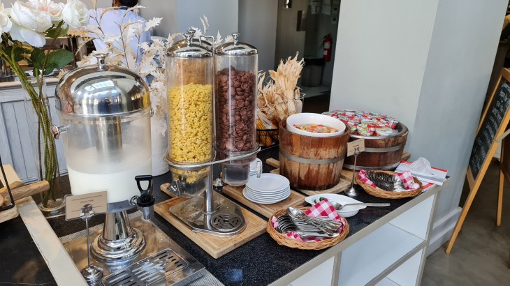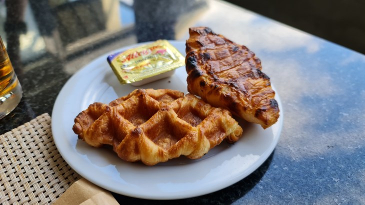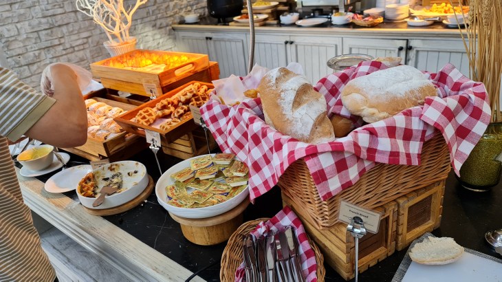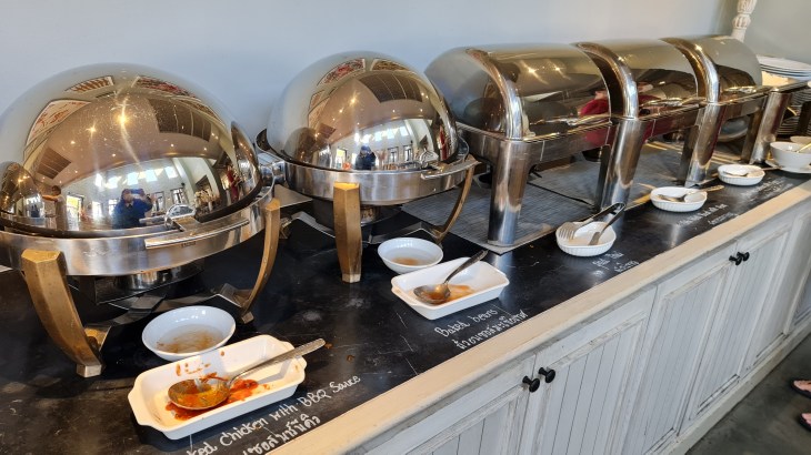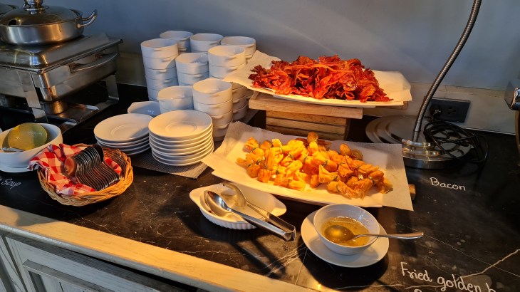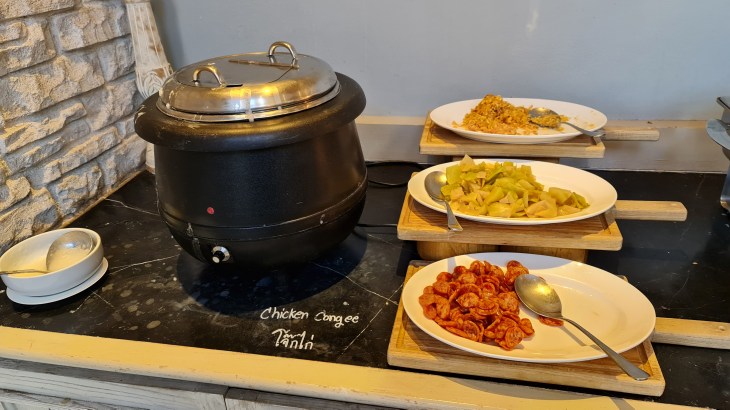 The buffet line had salad, fresh fruits, cakes and doughnuts, cereal, yoghurt and milk, bread loaves, waffles, croissants and sweet pastries. For hot selections, there are bacon, ham, fried wanton, baked beans, sausages, fried noodles and rice, fried chicken, stir-fried vegetables, Thai porridge as well as fried fritters with soy milk
