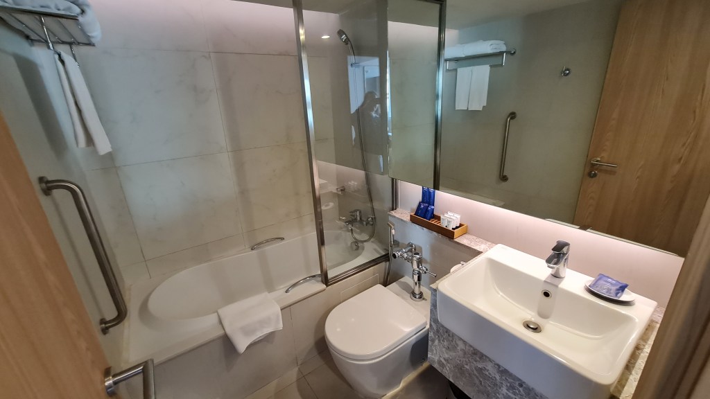 Basic amenities like toothbrush and toothpaste, comb, shower gel and shampoo are provided. While the overall cleanliness of the bathroom is pretty ok and everything was working well, you can tell that the tiling is slightly dated