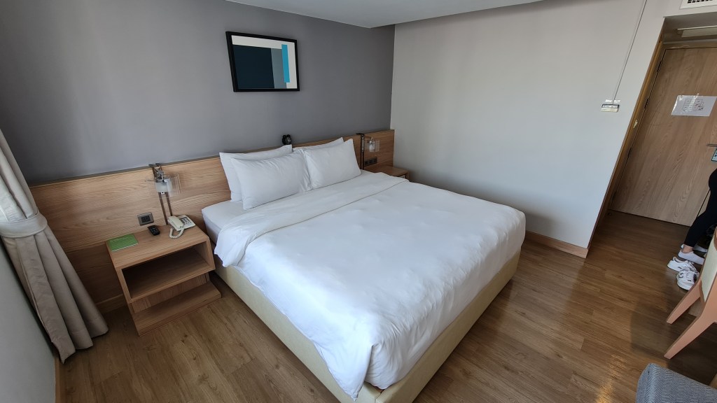 The room is decorated in white and light wood colour so it was in a minimalistic style which is both clean and simple. All the furnishings were well maintained although the bed was softer than my preference, it did not give me any backaches. From the door, there is an open wardrobe area where you can hang your clothes and also place your luggage