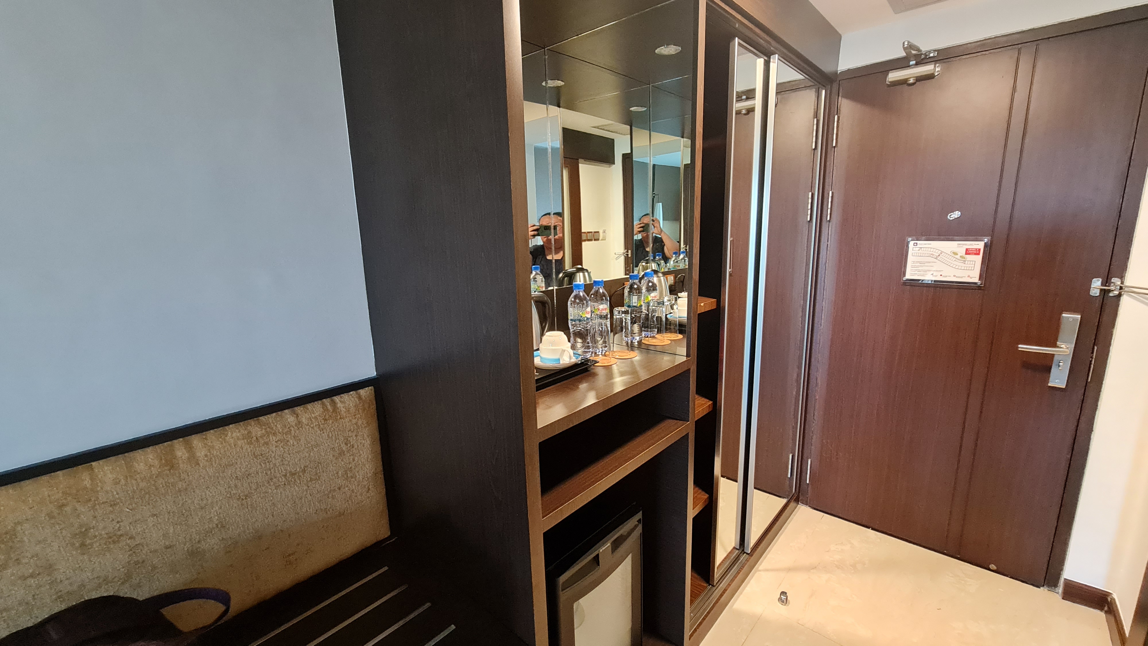 The size of the room is quite spacious for a twin room and there is an additional lounging sofa right next to the window. The view from the room was facing the empty field right in front of the hotel. The wardrobe by the door was of decent size for 2 people with a mirror at the bar area where a mini fridge, kettle, tea cups, coffee and tea and mineral water are provided. The bed is semi-hard and not too soft but the pillows were too soft and flat for me
