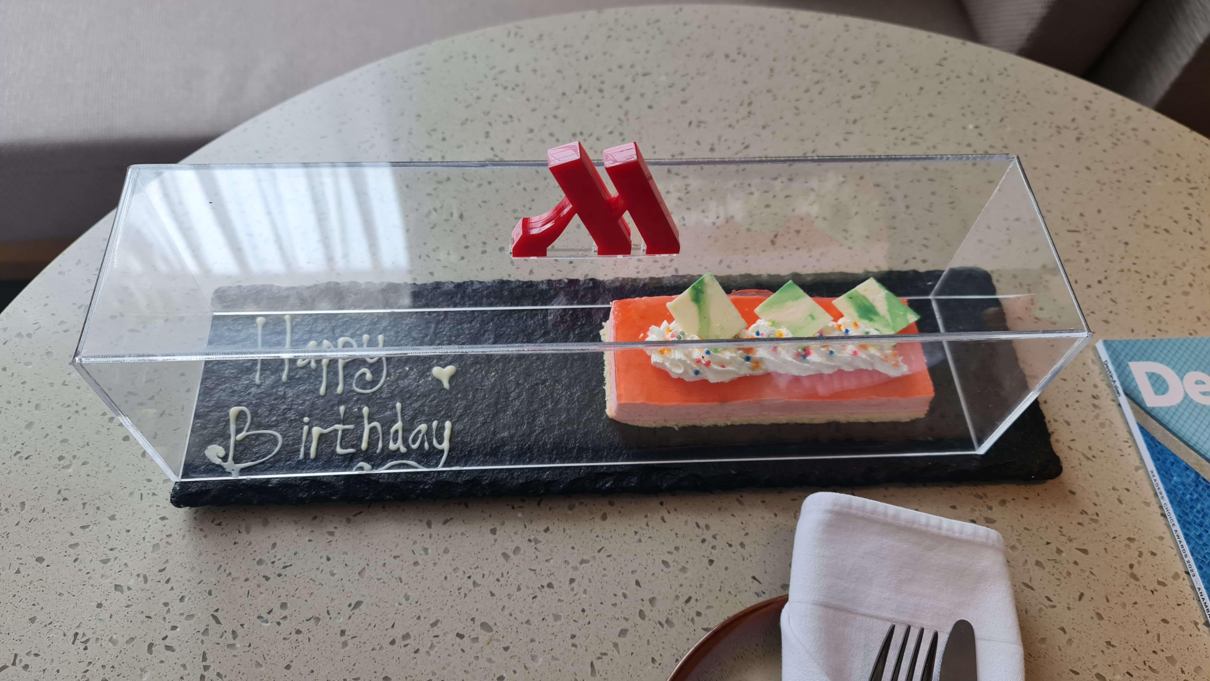 There was a small round table where you can eat or work from although it is not a proper work desk, there are powerpoints just next to the table and the natural light from the windows is quite sufficient. As we were celebrating my friend’s birthday, the staff made us a cute towel cake and mascot with a personally written message as well as an actual slice of cream cake on the table