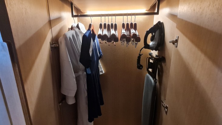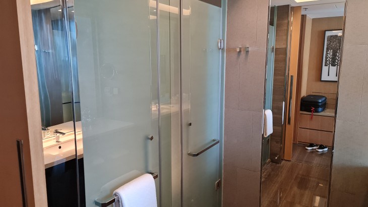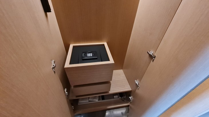 The wardrobe in the room was huge with 4 doors so there is sufficient space and hangers for 2 -3 guests. Ironing board and iron are provided within the wardrobe, there is also a safety box in the side cabinet next to the closet with amenities like laundry bags, shoe shine and shoe bags and bedroom slippers. Other amenities provided included coffee and tea bags, a kettle, drinking water, toothbrushes, soap, a sewing kit, a comb, a shaver and cotton wool. Shower gel and shampoo are provided inside the shower cubicle which is separated from the toilet. I loved the shower as the water temperature was hot and powerful enough for a relaxing bath