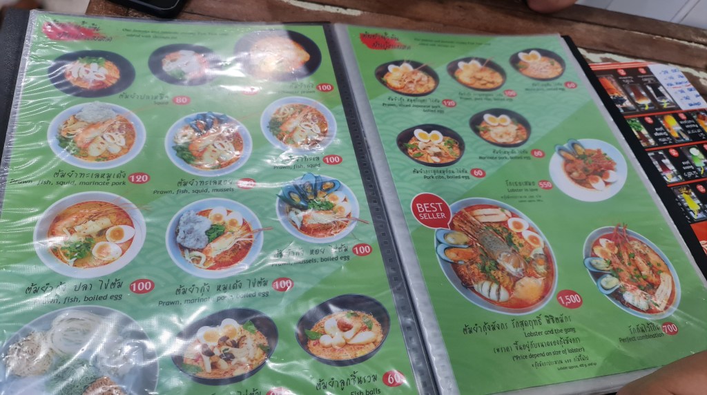 The menu is extensive with pages of different variations of tom yam noodles. You can choose different types of seafood to go with the noodles and the base price is from THB60 onwards. The popular one appearing in many social feeds is the most expensive one with lobster and many kinds of seafood at the price of THB 1,500. Personally, I was there to try the soup and not so much the seafood so I opted for one of the basic seafood and pork versions at THB120