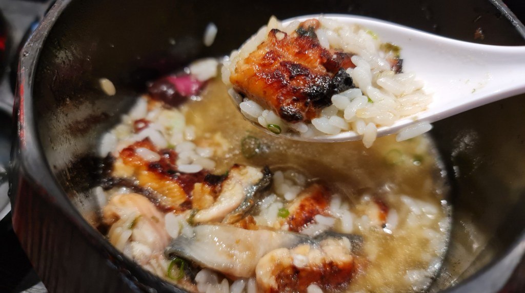 Lastly, using the eel and rice and bonito broth provide, make your own Ochazuke which is a porridge of some sort. The dashi broth is very light and savoury which watered down the sweet sauce on the eel. The overall result is a bowl of comforting flavourful rice porridge as the dashi was still very hot. This method of eating is the lightest of the 3 as the dashi gave it a balanced flavour which is neither too sweet nor salty. Personally, I like to eat the Hitsumabushi with the dashi as it is extremely flavourful and light at the same time, I will even add in some pickles for an added vinegary flavour