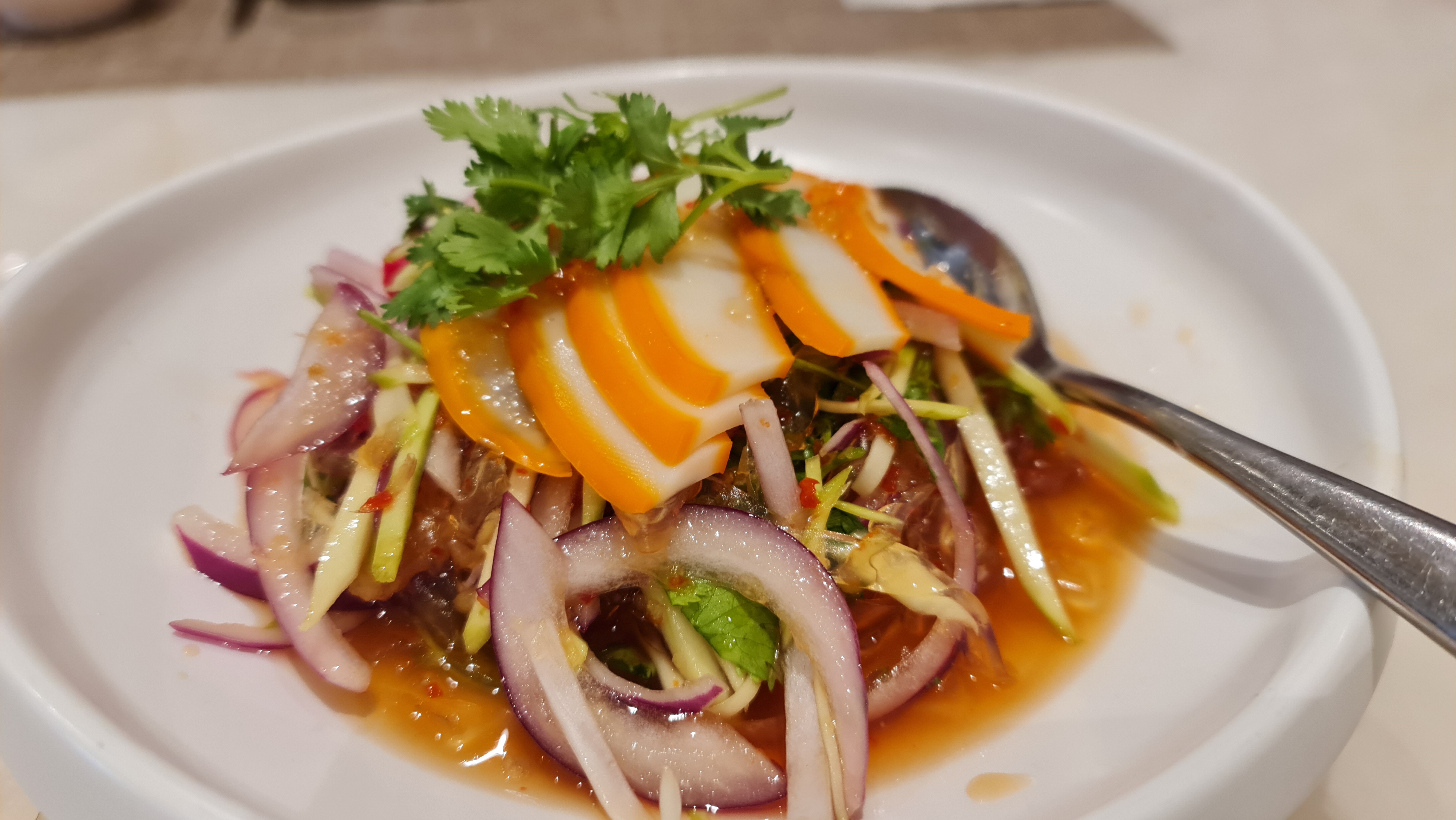 We started the meal with some appetizers; Chilled Squid with Flour Skin in Thai Style and meat dumplings in chilli oil which were served pretty fast. I was slightly disappointed when I saw the chilled squid as it is not the fresh squid but instead processed squid. The flavours were very tangy and spicy like a Thai salad but the squid was disappointing as it was chewy and rubbery. In comparison, the dumpling in chilli oil was missing the vinegarette flavours as this dish was supposed to be chilli vinegarette sauce so it was just spicy and not sour enough
