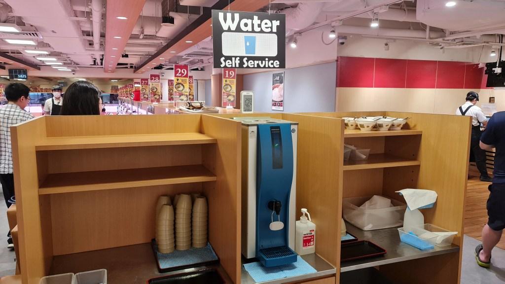 In between the rows of tables, there are water points where customers can get drinking water for their meals