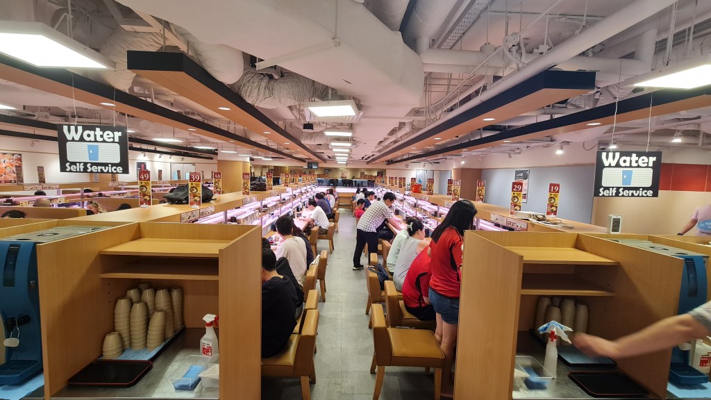 We were led into the restaurant almost immediately after we got a number for 2 persons. The restaurant is sectioned out into lanes of counter seats facing the conveyor belt or tables seating for families. All tables have a conveyor serving them as the food is all self-service