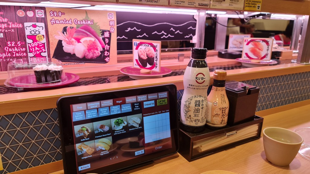At Sushiro, you do not have to worry about your orders getting mixed up as they are sent to you on the belt via a private lane which is above the conveyor belts so you will always get your items. The screen will ring a notification to show that you have orders arriving so you will not miss your orders