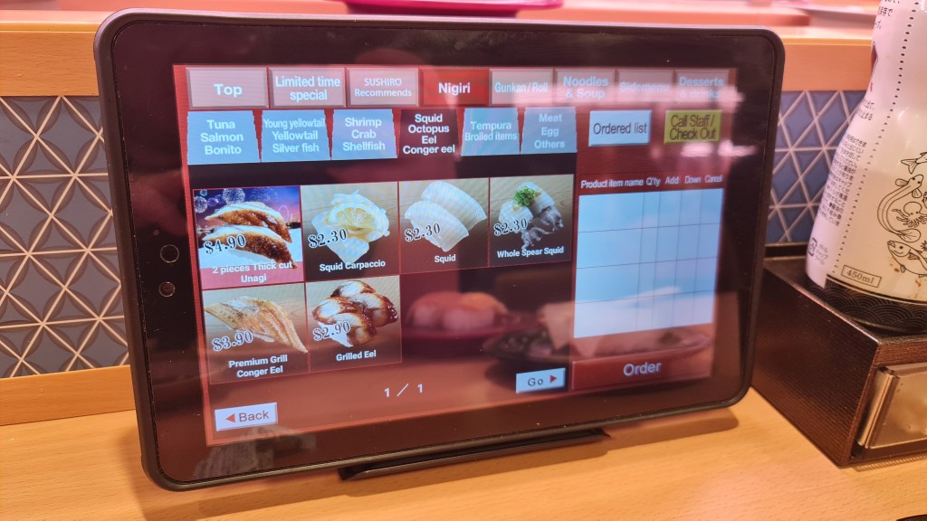 Customers can either help themselves to the assortment of sushi available on the conveyor belts or order via a touchscreen pad on each table. Condiments like soy sauce, pickled ginger and sweet sauce are also provided at each table while the wasabi is available on the conveyor belt free of charge