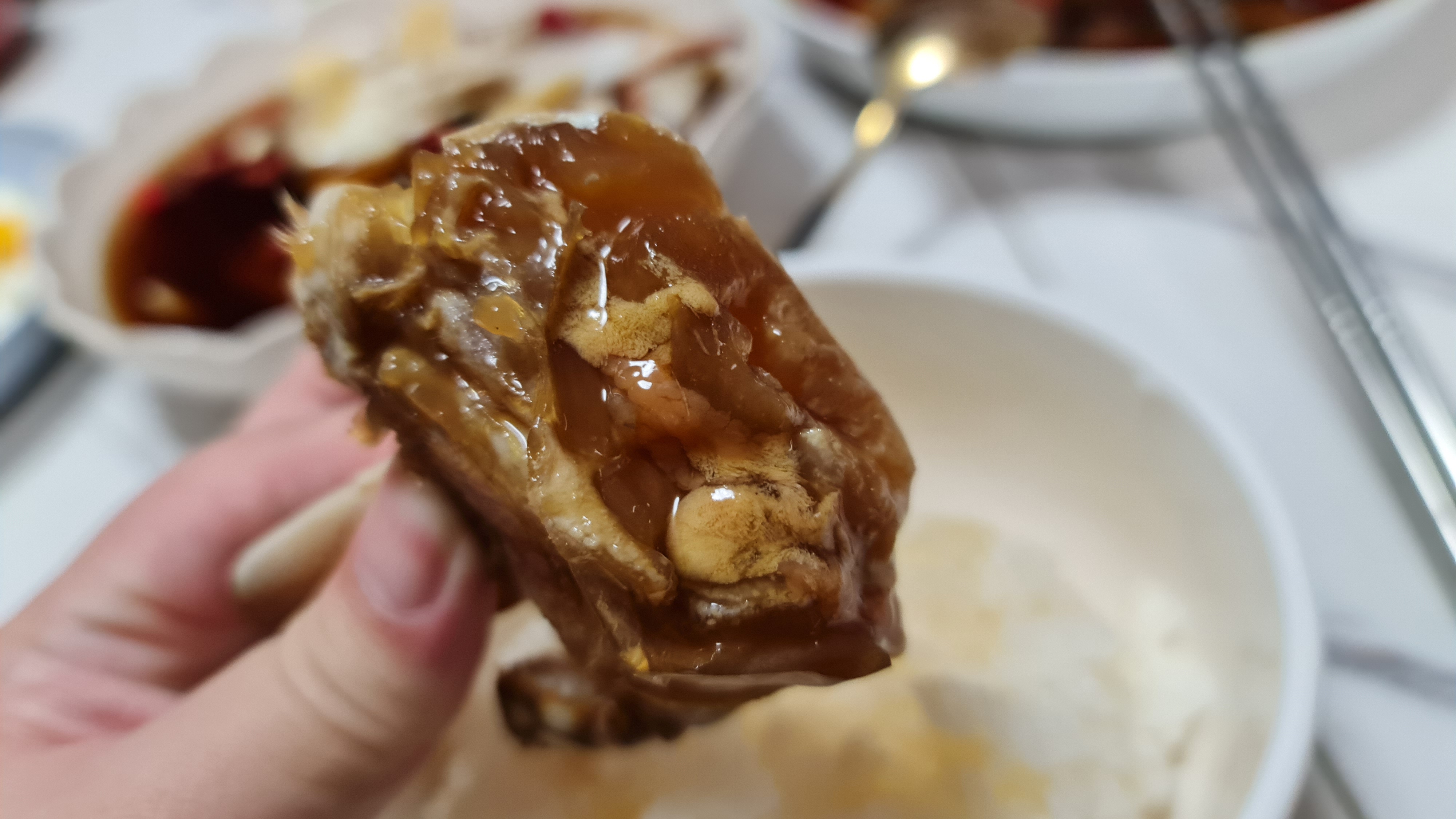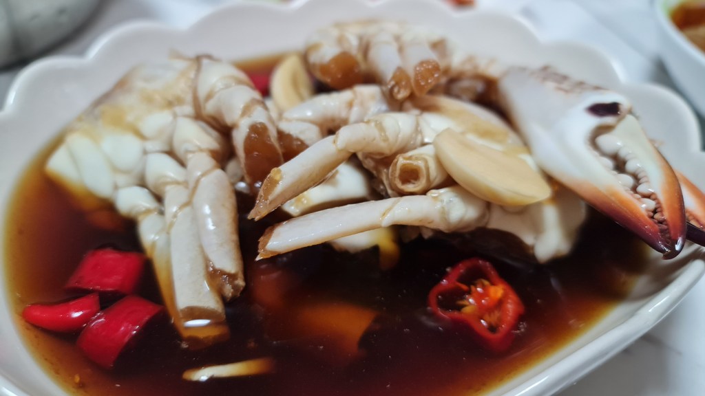 There were 2 crabs in the jar complete with a pair of pincers soaked in their marinating sauce of soy, chilli and garlic