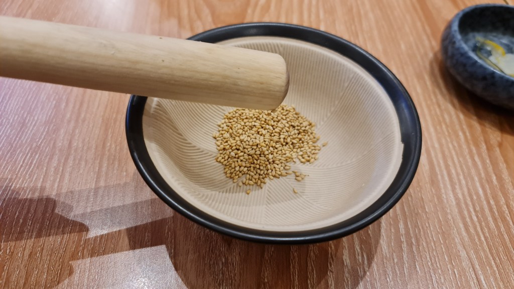Each diner is provided with a bowl of roasted sesame seeds and a traditional bowl for grinding the seeds which can be added to your tonkatsu sauce for an added nutty flavour. They also provide a soy-based salad sauce and sesame cream sauce for the raw cabbage salad that comes as a side with any tonkatsu order. The Japanese tonkatsu sauce is also provided for you to dip the pork slices