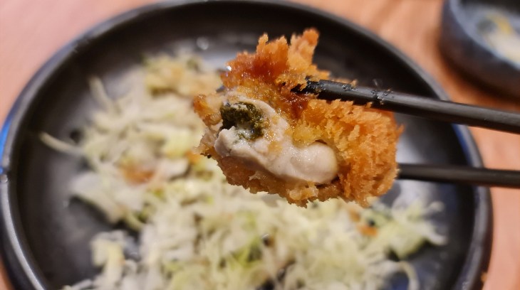 I also ordered a kaki fry which is the fried oyster. With every main tonkatsu order, the menu offers add-on orders of chicken katsu, ebi fry, kaki fry, salmon fry and hotate fry. The kaki fry add-on was SGD 5 which was on the pricey side. The oyster was evenly coated with panko crumbs and fried till golden and crispy while the oyster remained juicy and semi-cooked. As the oyster was not overcooked and dry, you can still taste the umami flavours from the oyster
