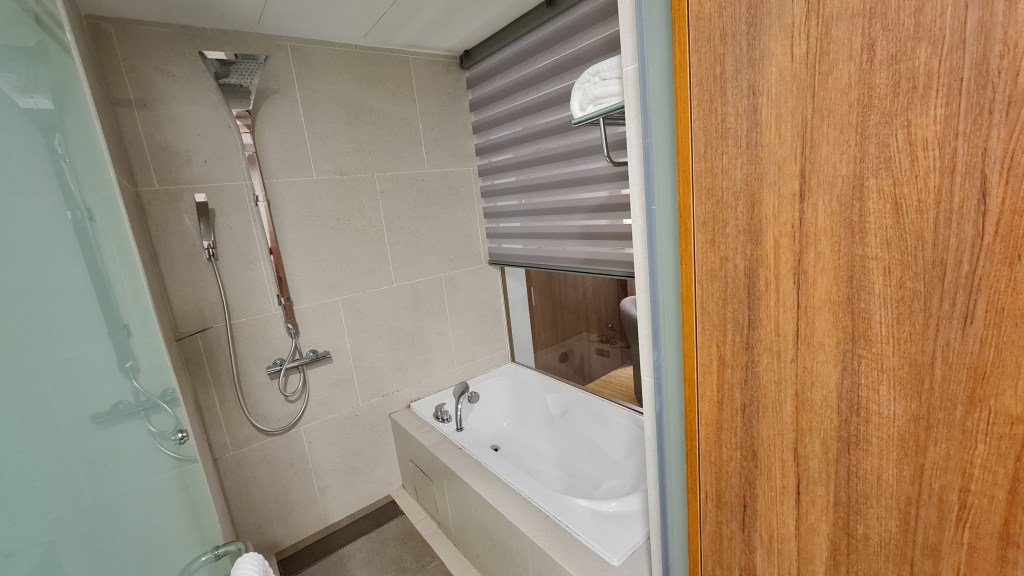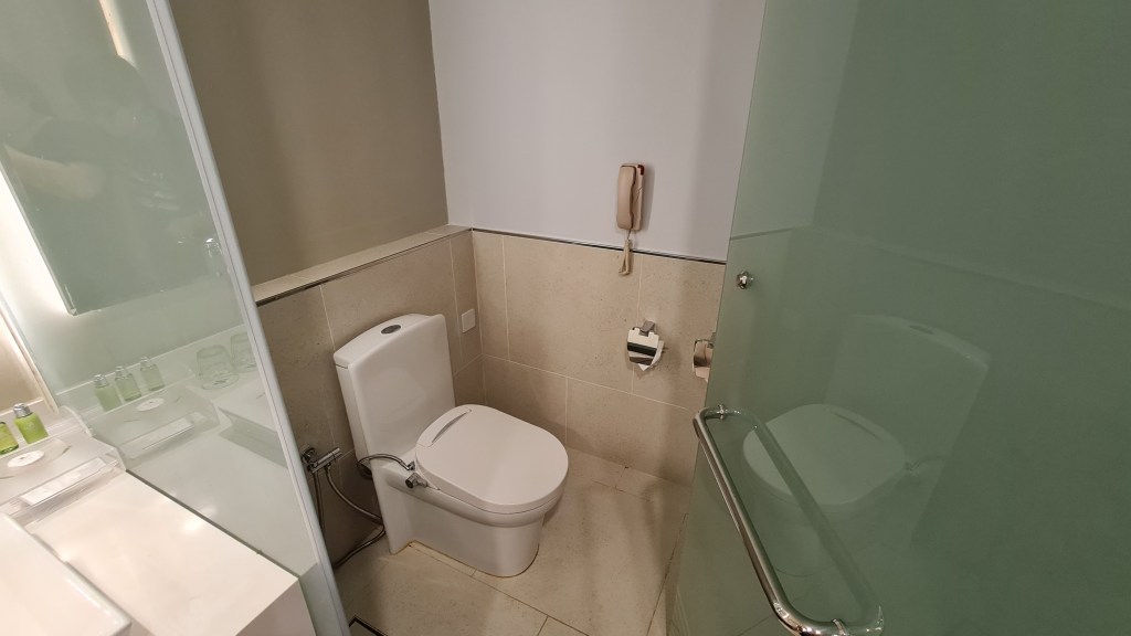 At an overall glance, the room was clean, new and extremely spacious with 2 twin beds, a desk area and an armchair for lounging. We had a room with a connecting door so it is possible for families or big groups to request connecting rooms. The furnishings within the room are well maintained and the beds and pillow were not too soft with sufficient back support. The toilet and bathroom are separated which is a feature I really like as the toilet can still be used if one guest is using the shower. The wash basin is located out of the shower and toilet and basic amenities like shower gel and toothbrush are provided. Although the overall cleanliness of the toilet and shower is fine, I found some small areas which are lacking maintenance like the mouldy crevices between the bathtub and tiles and the toilet seat. Although it does not affect the usage, it is not as pleasant to the sight
