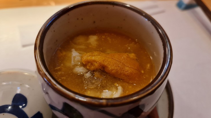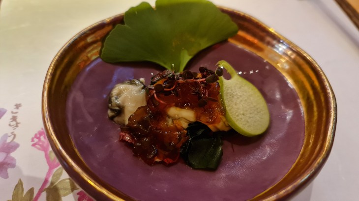 We started the course with water eggplant which was beautifully plated and served with a drop of concentrated sauce thus called water eggplant. The flavour was refreshing and light which is a good start to the meal. Subsequently, we were served snow crab chawanmushi topped with uni, grilled fish with cheese and a side of asparagus, oyster with lotus root stem, ponzu jelly and seaweed. Most of these dishes were nice and refreshing with light yet umami flavours