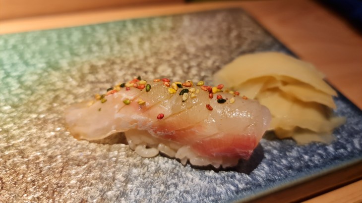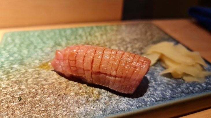 The next few courses were all sushi which included; seabream, bluefin tuna, Chutoro, Otoro, scallop with lime zest and uni and Ikura handroll spray with golden dust. The seabream and scallops were delicious and fresh and crunchy to the bite. I found the trio of tuna sushi slightly disappointing as they were not fatty enough and did not melt in the mouth. The handroll was over the top with the gold dust sprinkling but it was delicious as the uni was fresh and creamy while the Ikura was packed with umami flavours