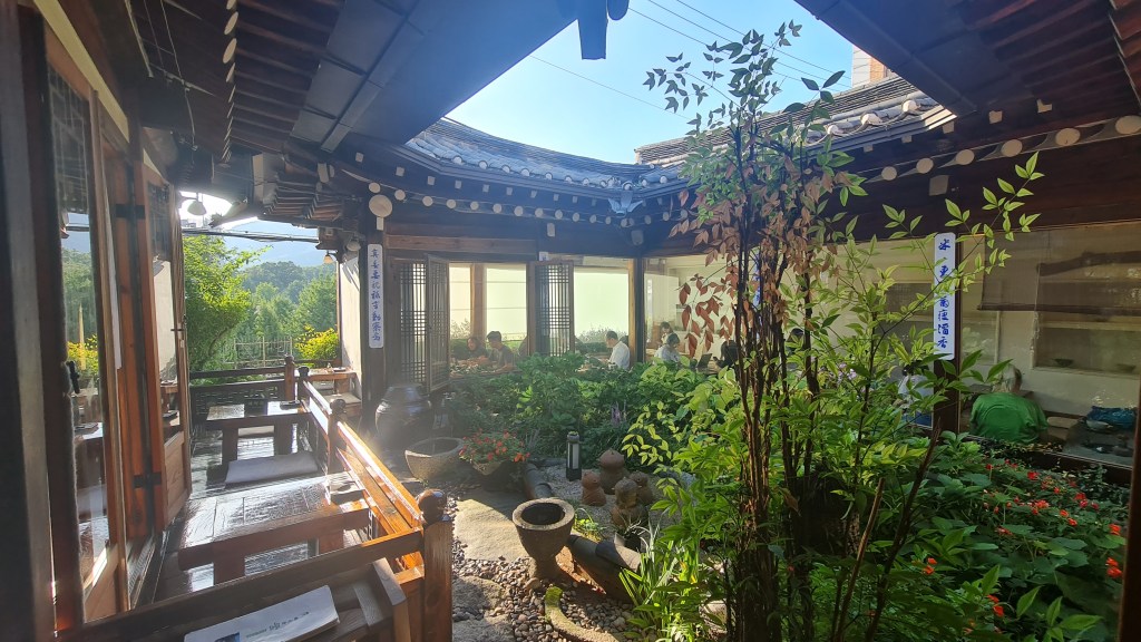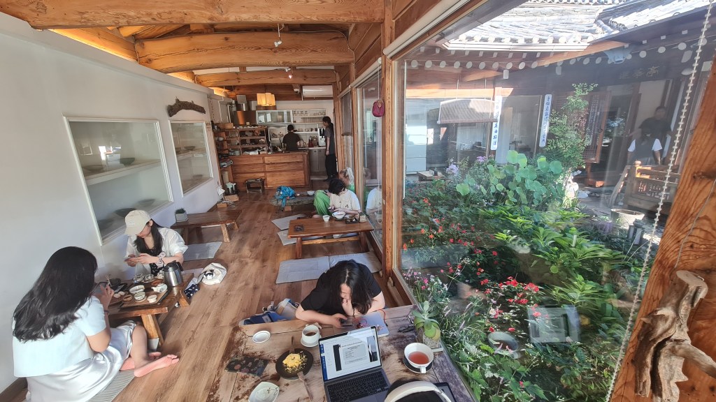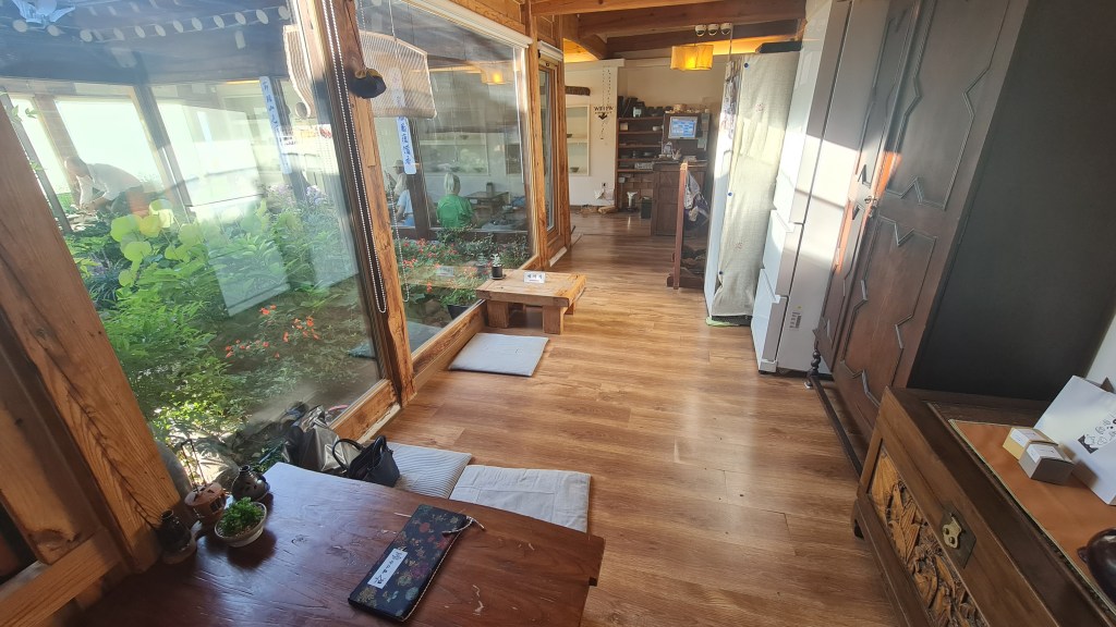 When I finally got ushered into the teahouse, I was greeted by this picturesque sight of gorgeous greenery amidst the traditional wooden structure of the 100-year-old Hanok. Minus the customers, this scene really looked like it came out of a Korean period drama. Full-length windows were installed so air-conditioning could be installed and customers could chill in the cooling temperature. The interior of the teahouse was kept as close to its original with necessary renewal to the walls and some of the ceiling beams. There is only 1 room with table and chairs so be prepared to sit on the floor when you visit