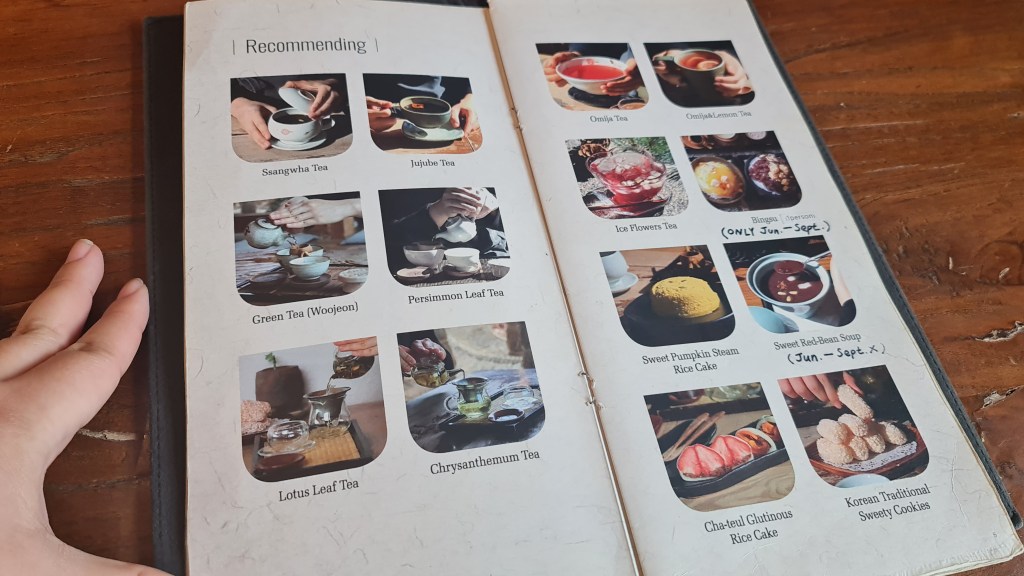 The menu features traditional Korean tea and snacks like Ssanghwa tea which is a popular herbal tea, Omiji tea ( five fruits tea), bingsu (seasonal) red bean soup (seasonal), persimmon leaf tea and mulberry leaf tea. You can also find other more common teas like green tea, chrysanthemum tea and flower tea