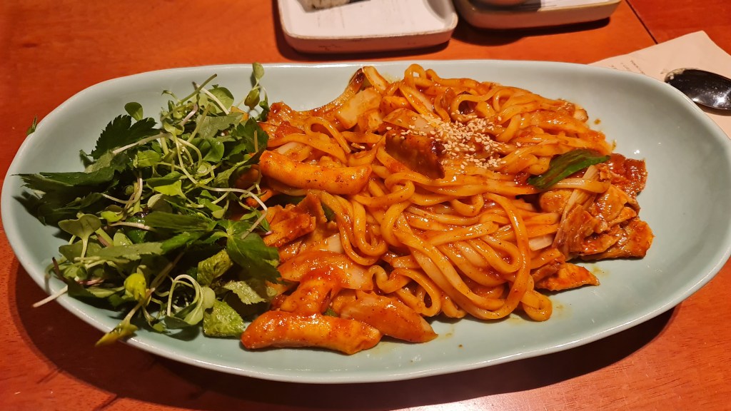 I ordered the stir-fried squid and pork belly with noodles which was served with a side of leaves to help balance the spiciness of the noodles. The dish tasted a lot like spicy Tteokbokki which you can get from the streets and while the noodles were supposed to come with squid and pork belly, there were also rice cake and fish cake. Lovers of Tteokbokki would love this dish but personally, I found it slightly heavy to finish by myself