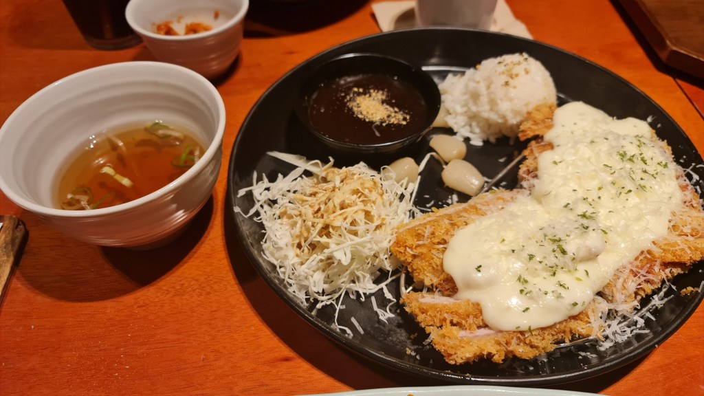 We ordered the snowflakes pork cutlet for sharing which came with a side of coleslaw with sesame sauce, tonkatsu dip, pickled garlic and an ice-cream ball of rice. The pork cutlet was topped generously with creamy cheese sauce as well as shredded cheese for extra cheesiness. The pork cutlet was crispy on the outside and tender inside and not too dry with the milky cheese providing another layer of creamy savoury flavour. This dish is quite heavy on its own and I would recommend ordering it for sharing