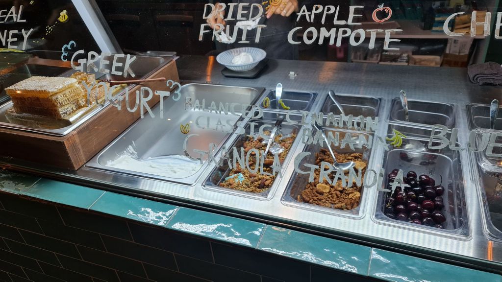 The cafe serves mainly fresh baked goods as well as some yoghurt bowls and beverages. There is not much hot food available except some cream soups