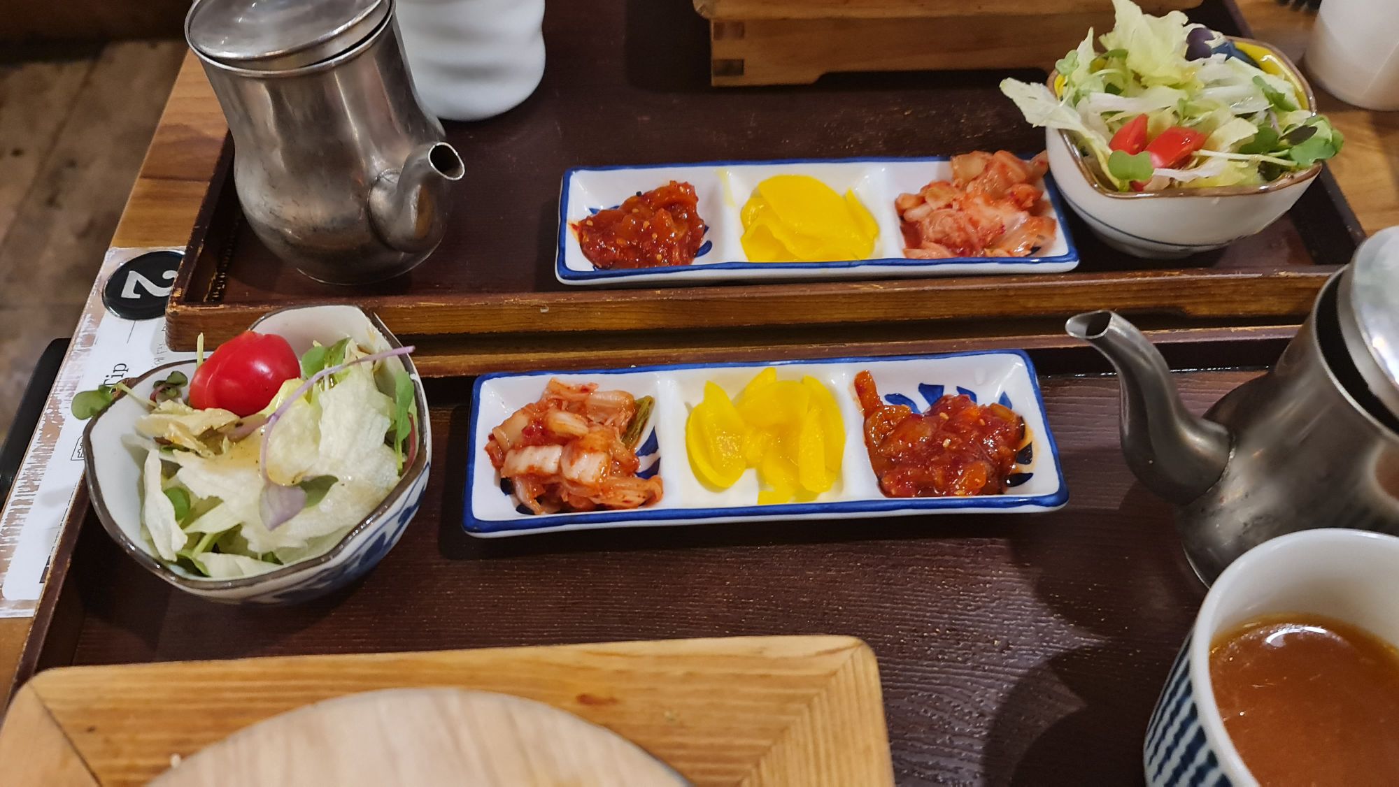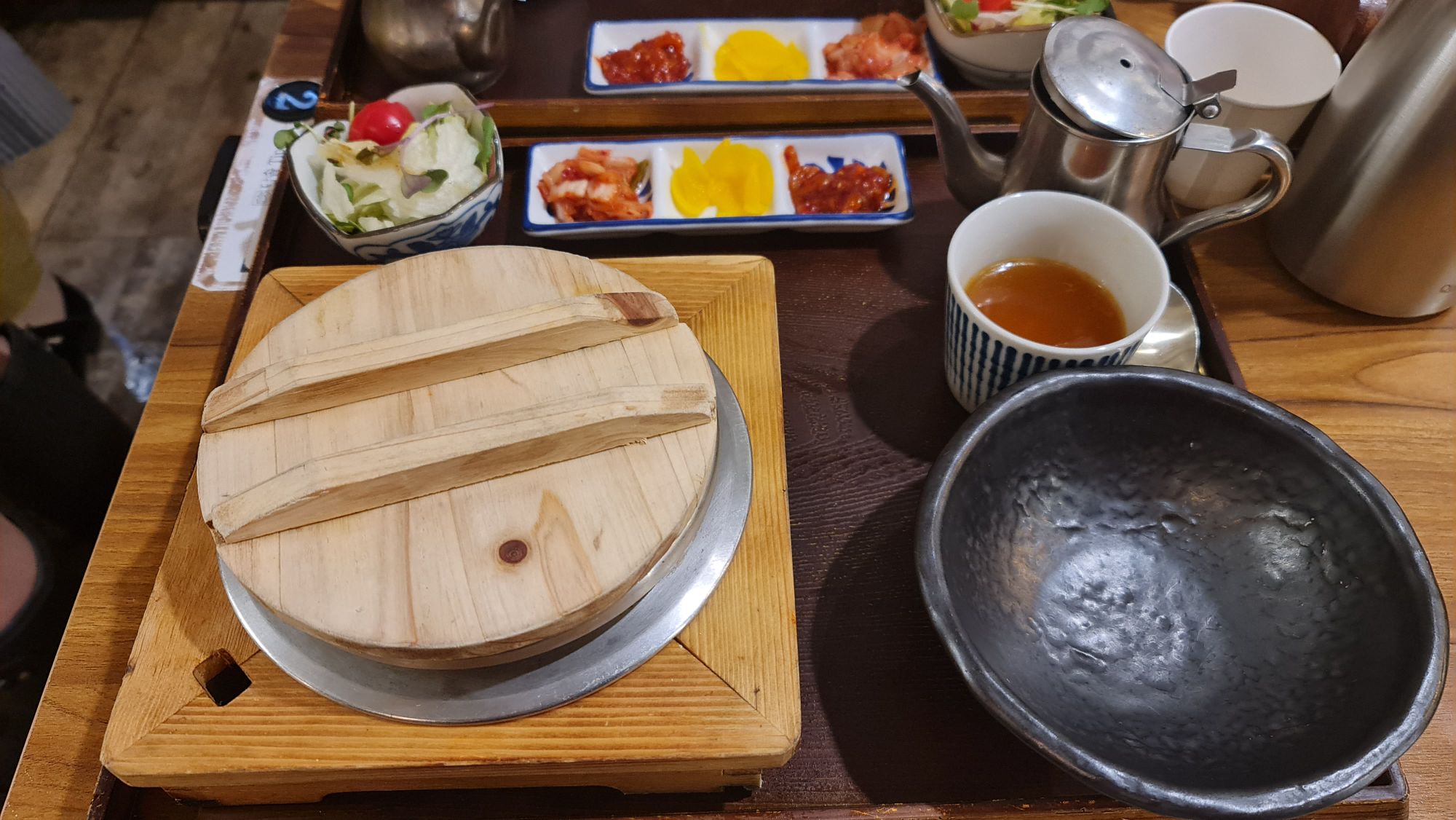 The table space is also extremely small and is just nice for the set meal tray with no extra space for other dishes. My friend ordered the beef beansprouts pot rice while I ordered the eggplant pot rice. They are KRW 12,000 and KRW 11,000 respectively. Each meal set came with a side of kimchi, a salad as well as a savoury broth to pour into the pot