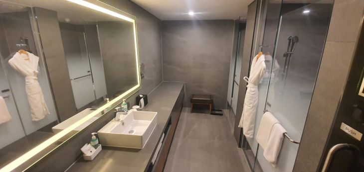The bathroom space is also huge with a long bench for you to place any make-up items. The huge mirror is a plus point for those who need to do their skincare or makeup routine. It would have been perfect if they included another sink for rooms with more occupants. The shower area and the toilet are separated which is good for people sharing the same room. All basic amenities are provided and the entire room is basically kept clean