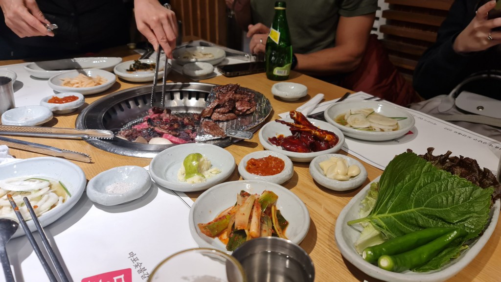 The side dishes served were different from most barbeque restaurants I have been to so far with unique items like; yangnyeom-gejang ( spicy raw crabs), Nokdu-muk ( mung bean jelly), Kkaennip-jangajji ( pickled perilla leaves). Some of the more common side dishes include: potato salad, pickled onions and cucumber, pickled sliced radish, cabbage kimchi and spring onion kimchi