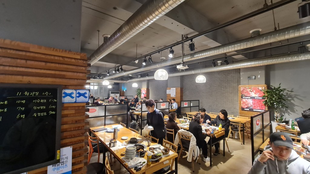 The restaurant is huge and spacious with an industrial chic design of cemented walls, and raw open ceilings paired with modern sleek lighting and furniture. At the entrance of the restaurant, it is not hard to notice the wall of fame with dozens of pictures of Korean celebrities pasted all over the wall like decoration. After my research, it seems that celebrities and K-pop groups like to visit this restaurant with their crew after the completion of a project as a celebratory dinner. During my visit, I did not notice any celebrities and the only one I recognised from the photo was Song Joong Ki