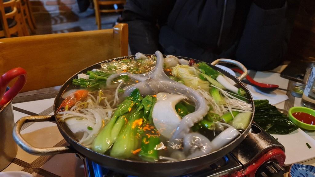 I did not see the menu so I was unsure if there was an English menu since everything was already ordered when I arrived. We had a clear soup hot pot which had prawns and different types of vegetables and mushrooms left to boil on the burner. When the soup started boiling, the lady came with a mid-sized live octopus and dumped it into the hot pot
