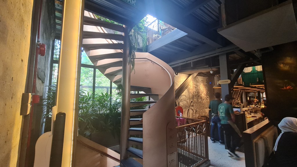 The cafe occupies up to 3 stories of the building and on the first floor is the main cashier and bakery counter where you can see the daily available bakes. There are also small singular tables for smaller groups who do not want to climb the steep stairs to the upper floors. The design of the first floor is quite eclectic with a mix of Malayan rainforest vibes combined with, industrial contemporary chic elements like the blue tiled counter and golden logo frame