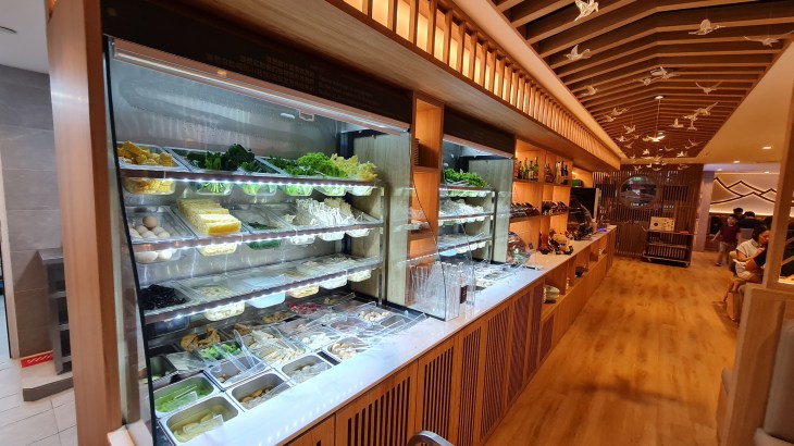 You can order the meat, seafood, and cooked items like xiao long bao, fried pancakes and dumplings via the QR code. Other items like vegetables, beancurd, frozen fishballs, meatballs and eggs are all self-service from the counter. The items are quite fresh within the chiller and some items and further soaked in iced water to keep them chilled and fresh. The staff also refill the items regularly. There are 2 sauce stations for customers to get their condiments and the variety is also good with the usual chilli, vinegar, sesame sauce, mala sauce and hoisin sauce