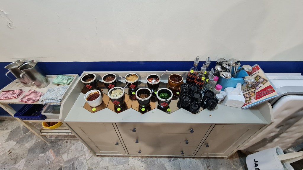 There is a small sauce and condiments table set up at the corner with a small variety of sauces like soy sauce, sesame sauce, chopped garlic, sambal sauce and other kinds of chilli paste