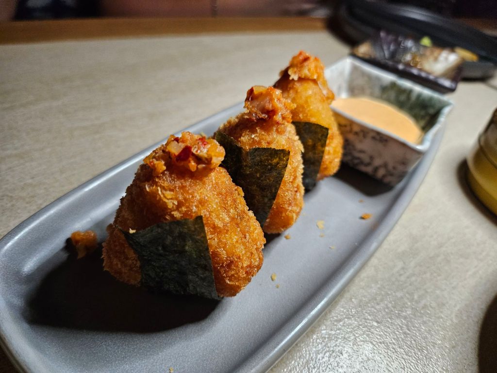 One item caught my eye from the menu and it was the kimchi onigiri arancini. An Arancini is a traditional Sicilian street food made of risotto that’s rolled into a ball, stuffed, breaded, and gently fried while the onigiri is a popular rice ball snack in Japan. The rice balls came served with a side of salad cream sauce and topped with chopped kimchi vegetables. The outside was fried till golden crispy and inside was warm and soft with bits of kimchi mixed into the rice. This is a great dish as a bar snack but can be filling as a starter