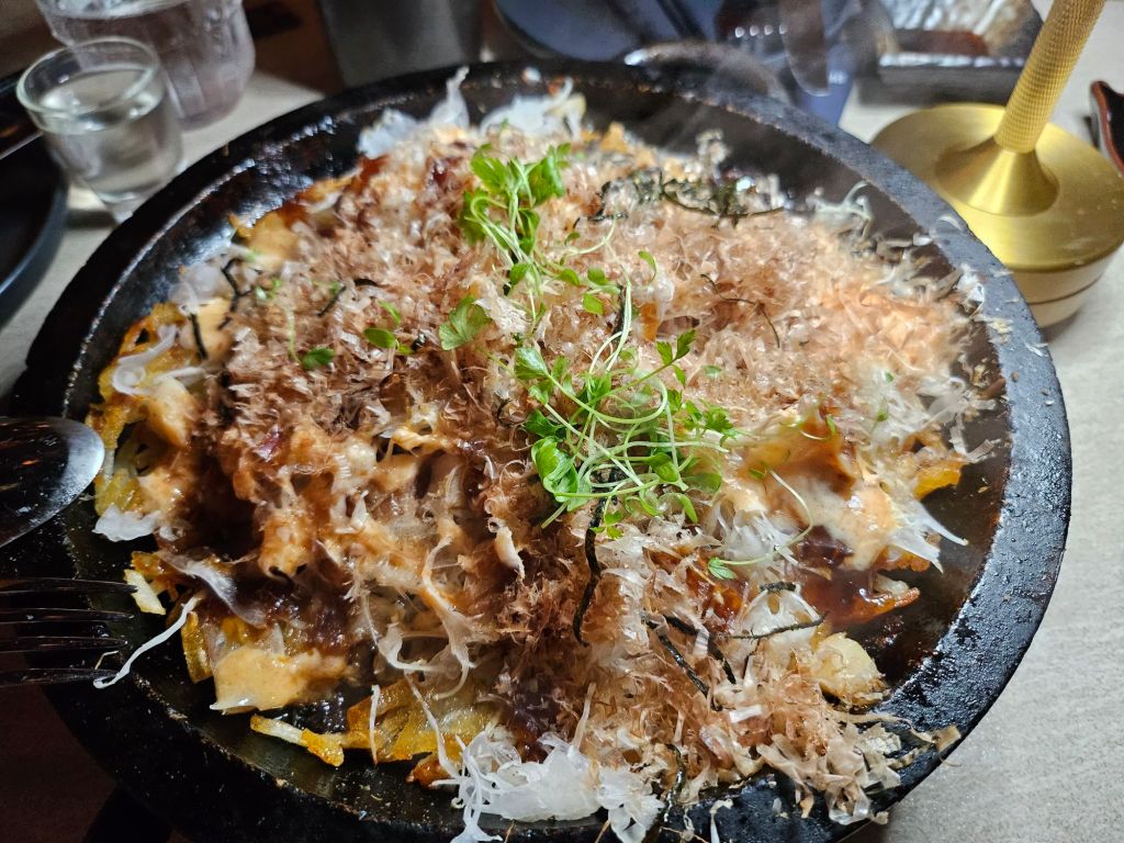 Another highly recommended dish is the okonomi-rosti which is made of shredded potatoes okonomiyaki, cabbage, scallops, bacon, bonito flakes and Mentaiko sauce. This was indeed the best dish for the evening as the potatoes were melted nicely into the hot plate and the cabbage was soft and flavourful when combined with the bacon and bonito flakes. The Mentaiko sauce added a nice tangy creamy flavour into the dish