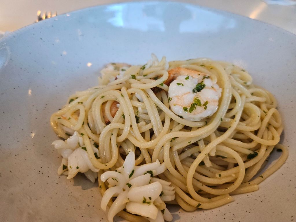 I had the seafood aglio aglio pasta where the serving was mid-size and just enough for a small eater. Those who eat a hearty meal will find this insufficient. The pasta was cooked slightly al dente and quite lightly tossed with olive oil and some chopped parsley. Personally, I found the dish too bland with light seasonings of salt. The dish was served with prawns and squid which were fresh and crunchy but also very lightly seasoned