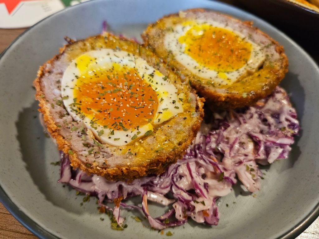 The last thing we ordered was the scotch egg which is a very English dish and can be found in most pubs. It is a pickled soft egg yolk wrapped with pork sausage meat covered with a breaded crust and served with purple slaw. This dish was delicious with a nice runny yolk which gave the meat a creamy sauce combining the flavours extremely well. The purple slaw added a tinge of acidity which was nice to help cut the greasiness of the meat