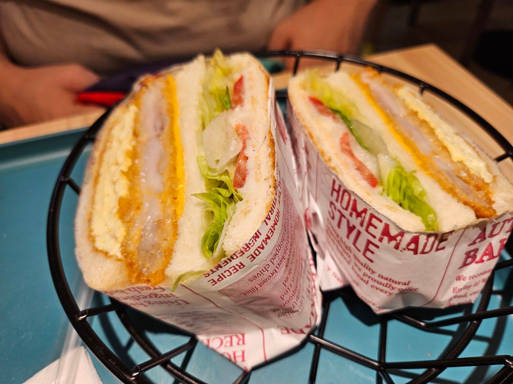 I had tea while my friend had coffee which was decent but nothing too special. The sandwiches were served sando style packed into waxed paper which was convenient for customers to pick up and bite even if they were eating on the go. We ordered 2 different kinds of sandwiches; one with normal ham and cheese with scrambled egg and vegetables and another the chicken cutlet with scrambled egg and vegetables. They were simple and clean in favour and felt like a fancier breakfast made at home. The bread was lightly toasted and the sandwich was basically packed full of ingredients so each bite had a good mix of meat, eggs and vegetables