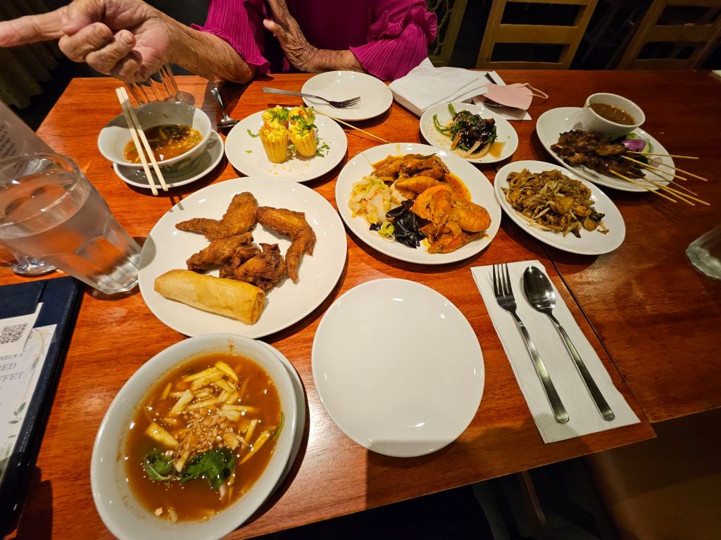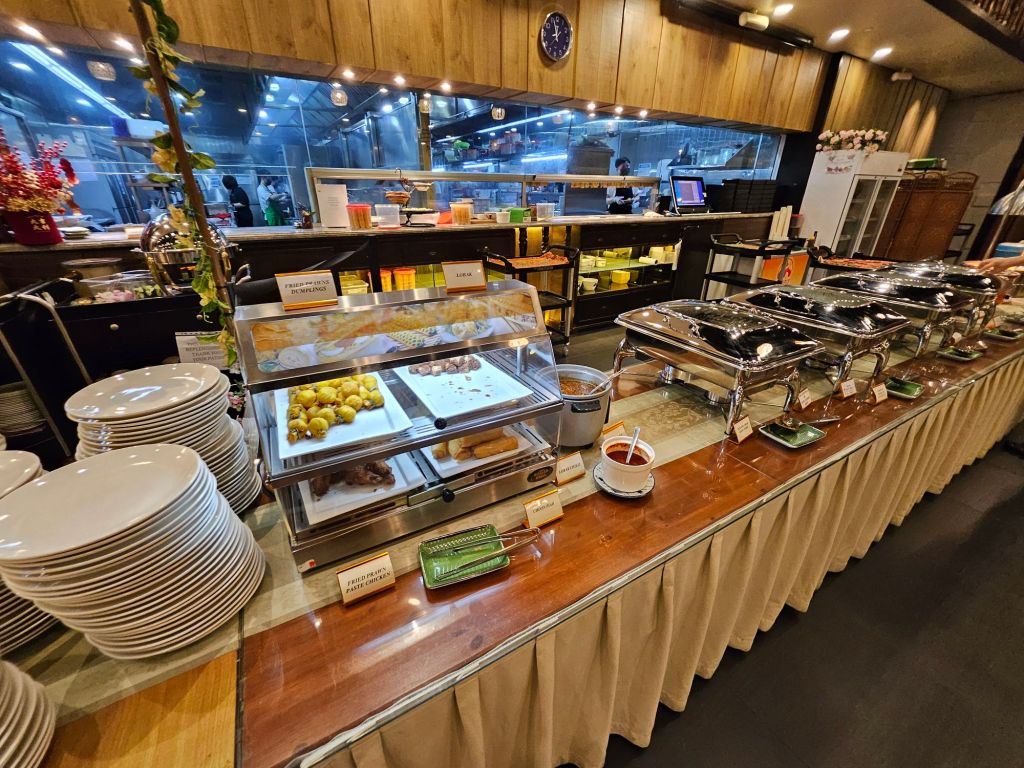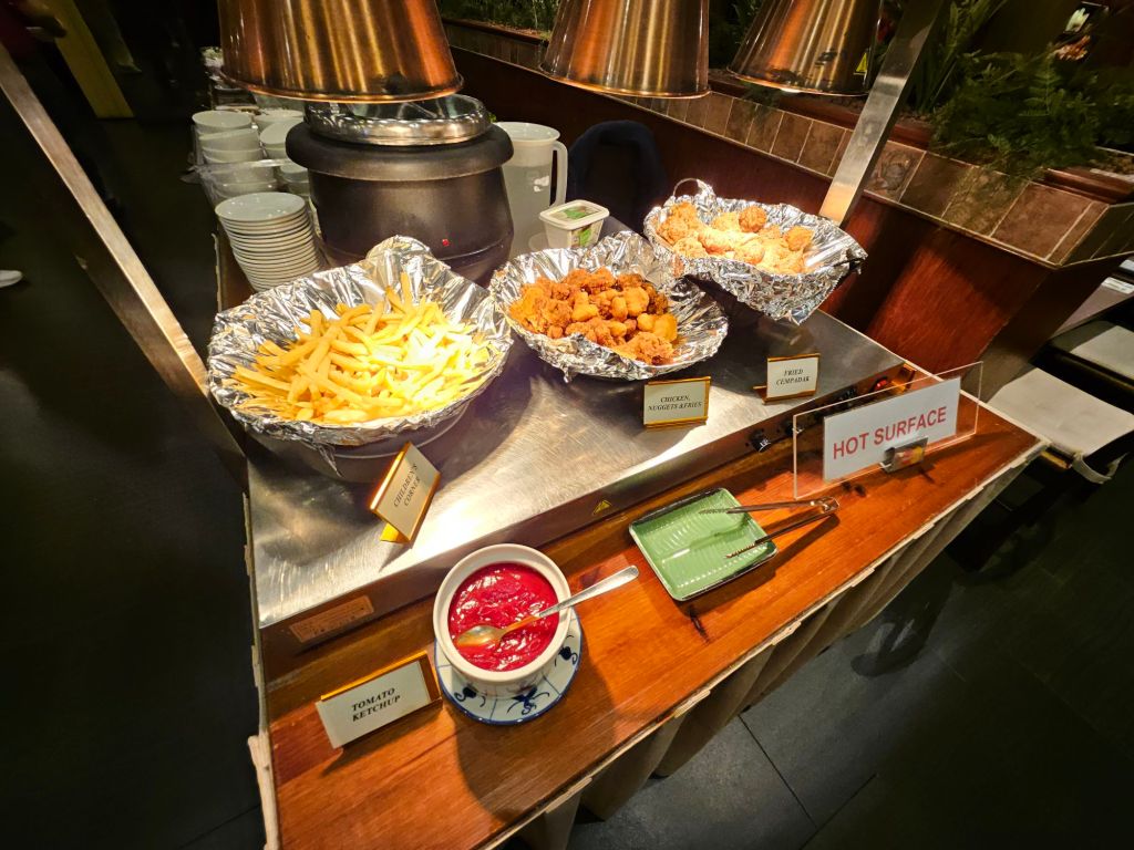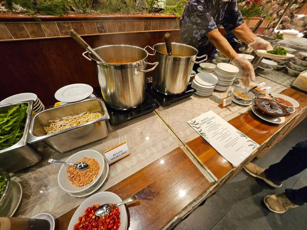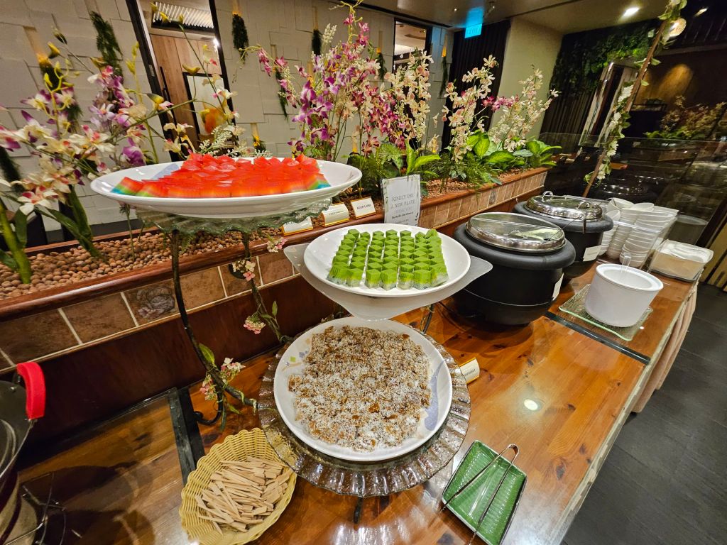 The buffet line has many different counters; the ones attracting the most diners have to be the live stations serving Penang Laksa and cuttlefish with kangkong vegetables. Other counters nearer to the kitchen include the satay and kueh pie ti station, the fried chicken nuggets, fries, and battered jackfruit. Some interesting self-service stations include; rojak, salad, nasi lemak and ice kachang. Other hot dishes include chicken curry, fried chicken wings, fried Penang kueh teow, fried rice, beef rendang and prawn curry. The huge selection at the dessert counter is also full of Penang kueh as well as hot and cold desserts like red bean soup