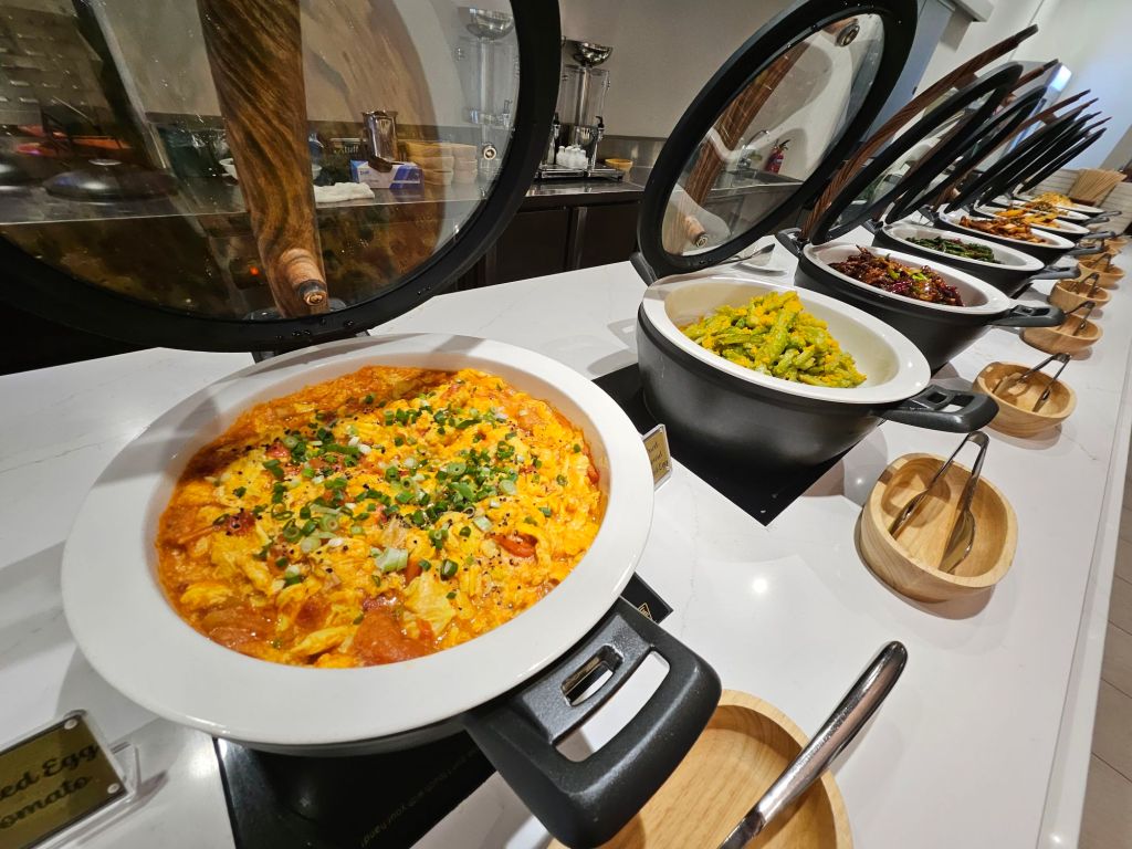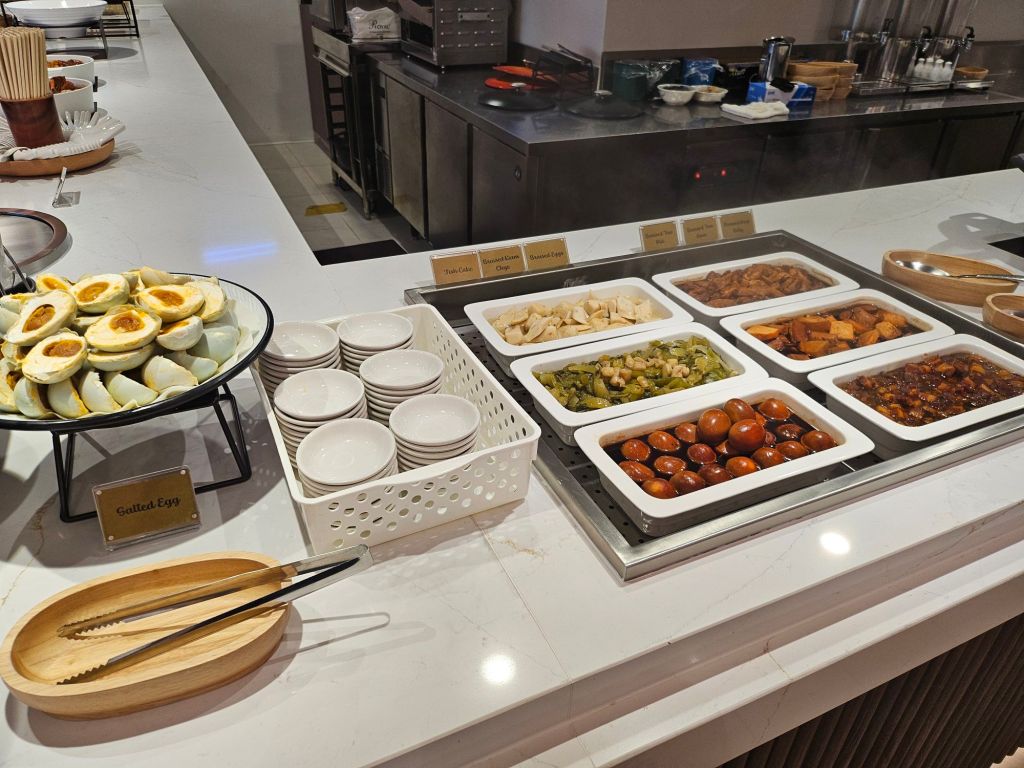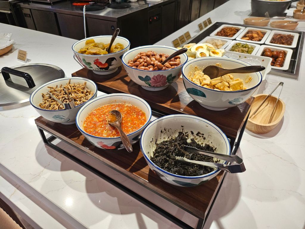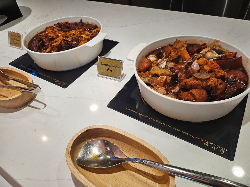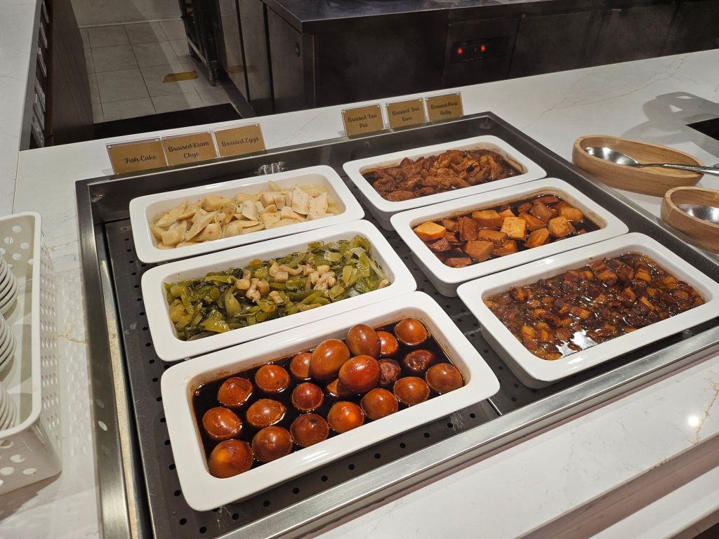 The front area of the buffet line is the braised pork trotter and braised chicken feet with beancurd skin pots followed by the traditional side dishes of Teochew porridge; steamed salted eggs, fermented beancurd, olive vegetables, ikan bilis, peanuts, fish cake, salted vegetables, braised eggs, braised pork belly, braised tofu and tau pok