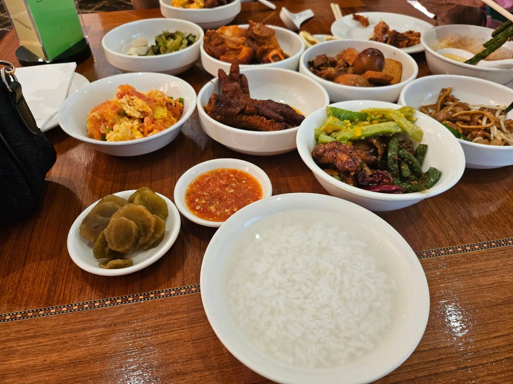 The next section is cooked dishes which can be eaten on their own or paired with porridge or rice. The dishes offered on the day we visited included; fried tomato eggs, salted egg yolk with beancurd, chili long bean, fried fish, fried pork belly with onions, fried gong bao chicken, fried kway teow and fried rice
