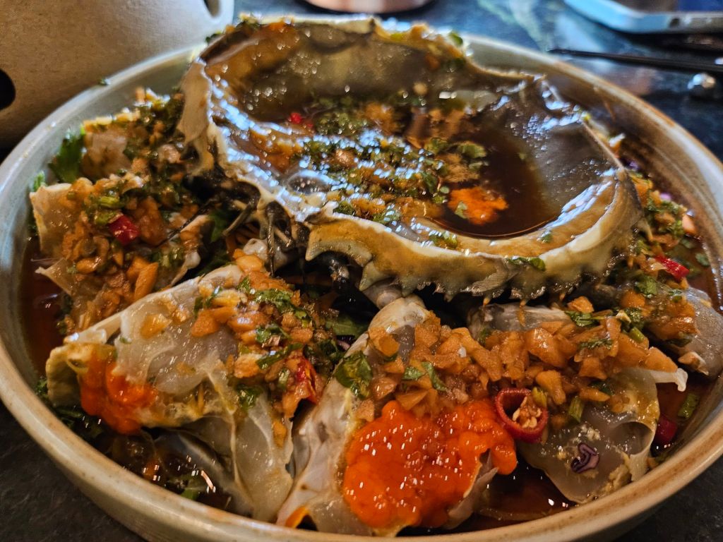 The next dish was the highly recommended signature marinated raw crab which costs SGD 78 per 500 grams. We ordered 1 mid-sized crab which was full of roe and quite sufficient for 5 of us to share. Different from the Korean version, the Teochew version came with a lot of chopped garlic, spring onions and parsley which was mixed with the sauce and topped on the crab. There was some cut red chilli to give the dish an overall light spice punch. Our dining group consisted of 4 people who love the Korean version a lot which could also be the reason why we could not get used to the different flavours. We found the version here very light in taste which in turn could not cover the slightly fishy taste of the crab and the garlic overpowers the sweetness of the crab meat which was missing in this dish. The dish was nice but not wonderful in our opinion