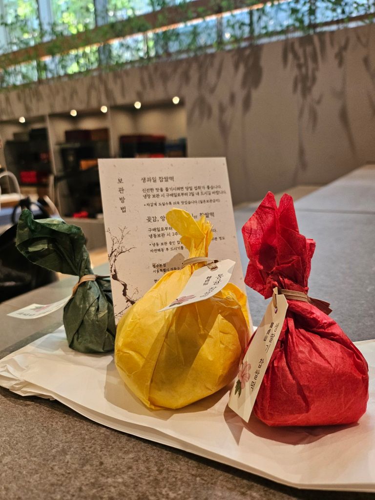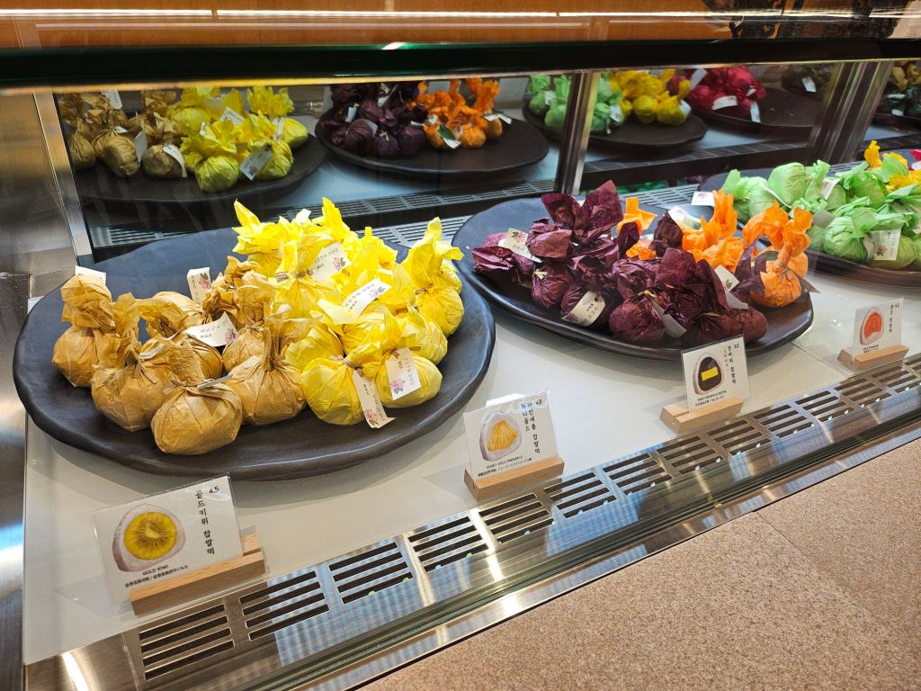 They offer gift box packaging for those who wish to buy them as gifts in these traditional and pretty Korean cloth-wrapped boxes. The flavours available were gold kiwi, honey gold pineapple, sweet red bean and butter, dried persimmon, strawberry, strawberry with mugwort mochi, tangerine, shine muscat grape and Dubai chocolate