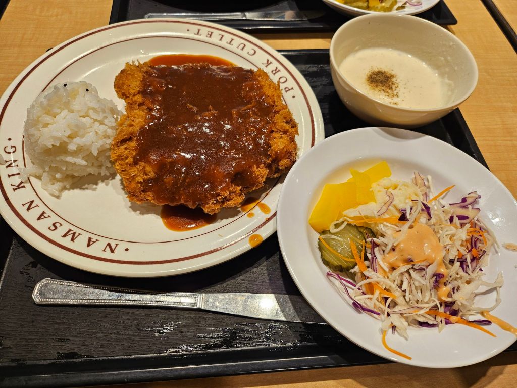 Each tonkatsu is served with a side salad with pickles on the side and Thousand Island sauce. There is also a small bowl of cream of mushroom soup